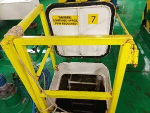 Before entering, all the systems of work and the equipment are checked and tested, and all work is carried out in accordance with the permit to work. In this case, gas alarms are used to monitor any build-up of fumes or gas and the area is being flushed with air using fans.