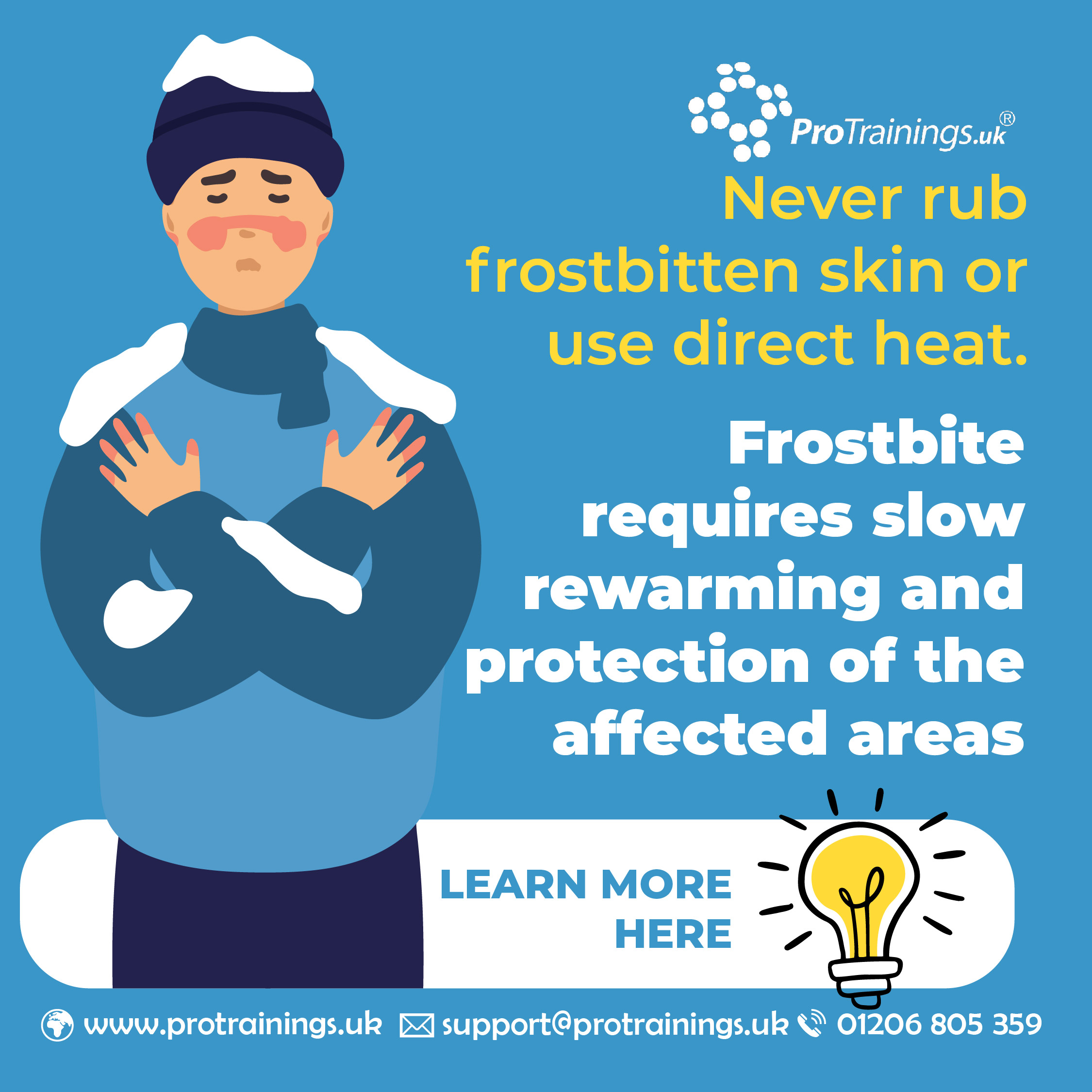 - Frostbite requires slow rewarming and protection of the affected areas. Never rub frostbitten skin or use direct heat.